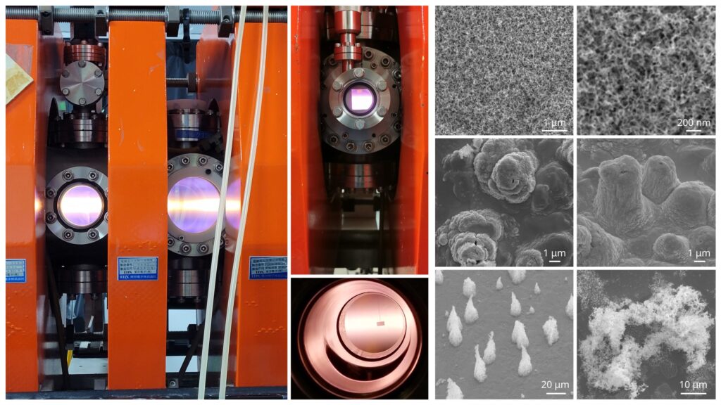 ネオンやアルゴンを少量混ぜて生成したヘリウムプラズマの中にタングステン板を挿入すると(中央下の写真内の長方形がタングステン板)、試料は1000℃を超える温度まで加熱されます。この状態でプラズマを一定時間照射し続けると、ファズとよばれる太さ数10ナノメートル程度の綿毛構造(顕微鏡像の上段)や、数100ナノからマイクロメートルの太さをもった柱状を意味するピラー構造(中段)、ファズやピラーが複雑に絡み合ってマイクロメートルまで巨大化したナノ・テンドリル・バンドル(NTB)構造(下段)が試料表面に再現性高く形成されます。